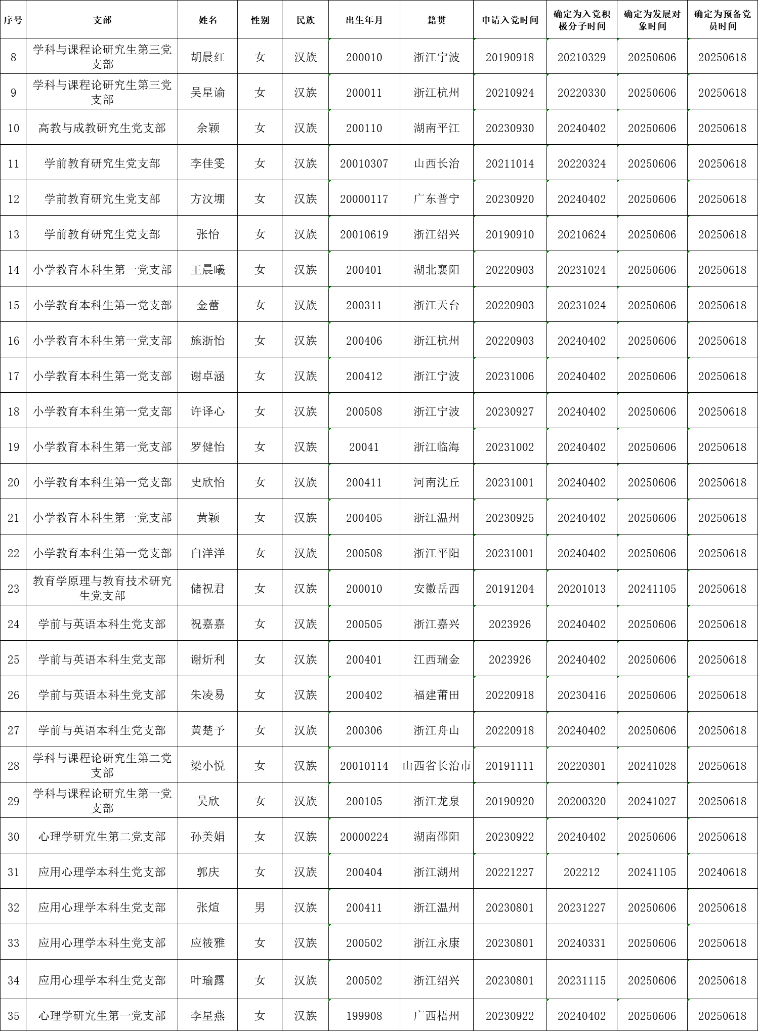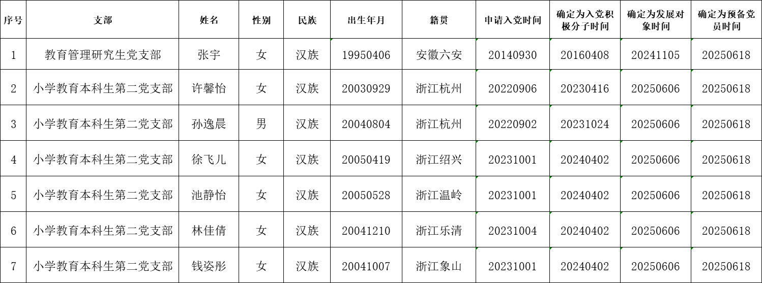 根据《中国共产党发展党员工作细则》中发展党员的文件要求,经对张宇等35名同志的接收为中共预备党员条件、接收程序等进行严格审查。2025年6月27日,学院党委会集体审议讨论了张宇等35名同志的接收问题。党委委员共7名,实到会7名。经逐个审议和表决,7名党委委员一致认为张宇等35名同志已具备预备党员条件,同意批准接收为中共预备党员,预备期为2025年6月18日至2026年6月17日。具体名单公布如下:
