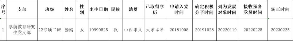 根据《中国共产党发展党员工作细则》中发展党员的文件要求,经对晏婧同志的预备党员转正条件、转正程序等进行严格审查。2023年2月28日,学院党委会集体审议讨论了晏婧同志的转正问题。党委委员共7名,实到会7名。经逐个审议和表决,7名党委委员一致认为晏婧同志已具备正式党员条件,同意批准按期转为中共正式党员,党龄从预备期满转为正式党员算起。具体名单公布如下: