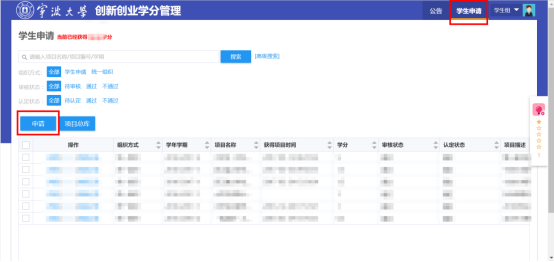 3. 依次点击“学生申请”->“申请”按钮即可进入申请界面,填写相关信息。