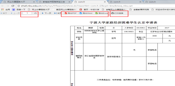 2、 家庭经济困难学生认定申请表如图所示,可进行导出和在线打印操作,其中导出支持pdf/word/excel三种格式。勾选多个学生家庭经济困难学生认定申请表”的导出是导出一份多页的文件,每位学生占一页。