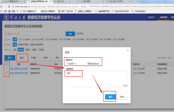 4、 退回操作:点击退回按钮按照弹窗选择退回的环节,输入意见,点击确认,即送至所选退回环节。可以选择退回到学生个人、班主任、辅导员等显示岗位以下的环节)