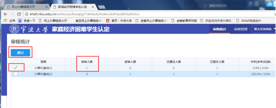 审核统计页面也可进行批量审核操作勾选班级后,点击“通过”按钮,可对所选择班级中所有待审学生进行批量通过操作。