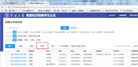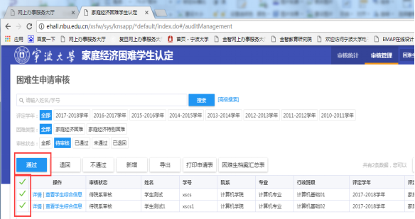 单选或多选学生申请记录,点击“通过”、“退回”按钮可以批量审核学生申请。