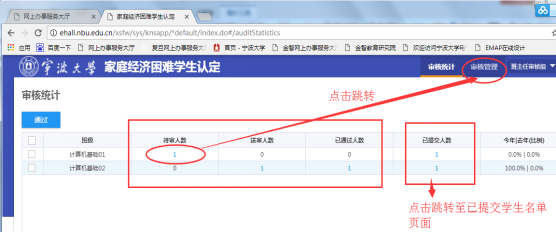 1.点击表示人数的蓝色数字可跳转至待审、送审、通过等审核页面提交学生页面