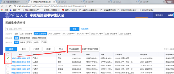 1、 勾选单个、多个学生,点击打印申请表”按钮,可进行家庭经济困难学生认定申请表的查看。