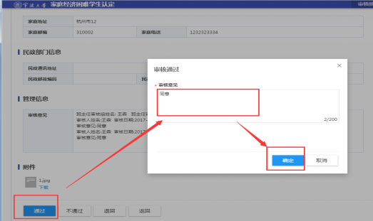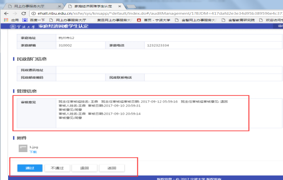 2、 进入学生非学业因素详情页面,可查看学生填报的申请信息、家庭成员、家庭情况、已获资助、附件等信息其中点击“申请信息”,老师可修改学生评定的困难类型。页面下方管理信息可查看申请流程其他环节办理情况。附件可在线浏览和下载,其中图片支持在线浏览,文档支持下载查看。信息审阅后点击底部“通过”、“退回”和“返回”进行相应操作。