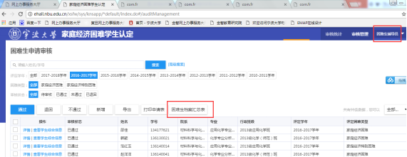 1、 点击困难生档案汇总表”按钮,可查看当前角色管理的学生家庭经济困难学生档案表