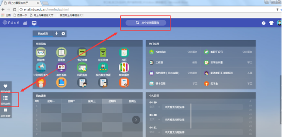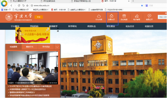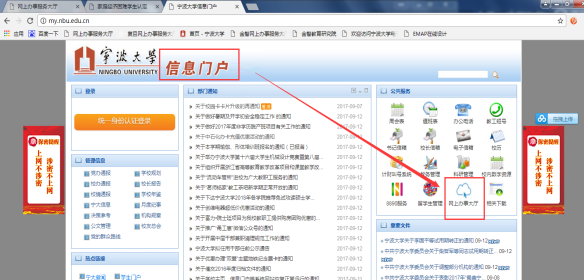 1、 宁大内网主页右侧点击网上办事大厅或学校外网主页上方点击“办事大厅”并登录。