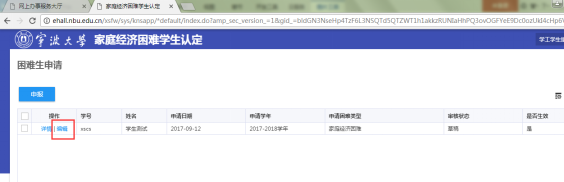3. 如老师退回修改,点击这条申报记录前的“编辑”按钮进入家庭经济困难学生申报页面,修改后点击“提交”再次提交给老师审核