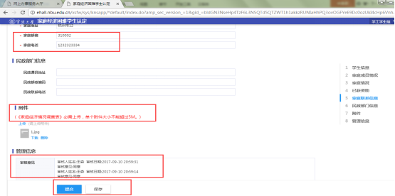 2.进入家庭经济困难学生申报页面,按照页面要求一项项填写申报信息。其中红色星号为必填项。填写好之后上传《家庭经济情况调查表》等附件,单个附件大小不超过5M点击“保存”按钮,填写过的信息保存为草稿,下次还可继续编辑提交。点击“提交”按钮,进入老师审核流程。