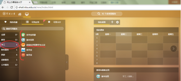 或在“可用应用界面点击学工栏目找到“家庭经济困难学生认定”应用。
