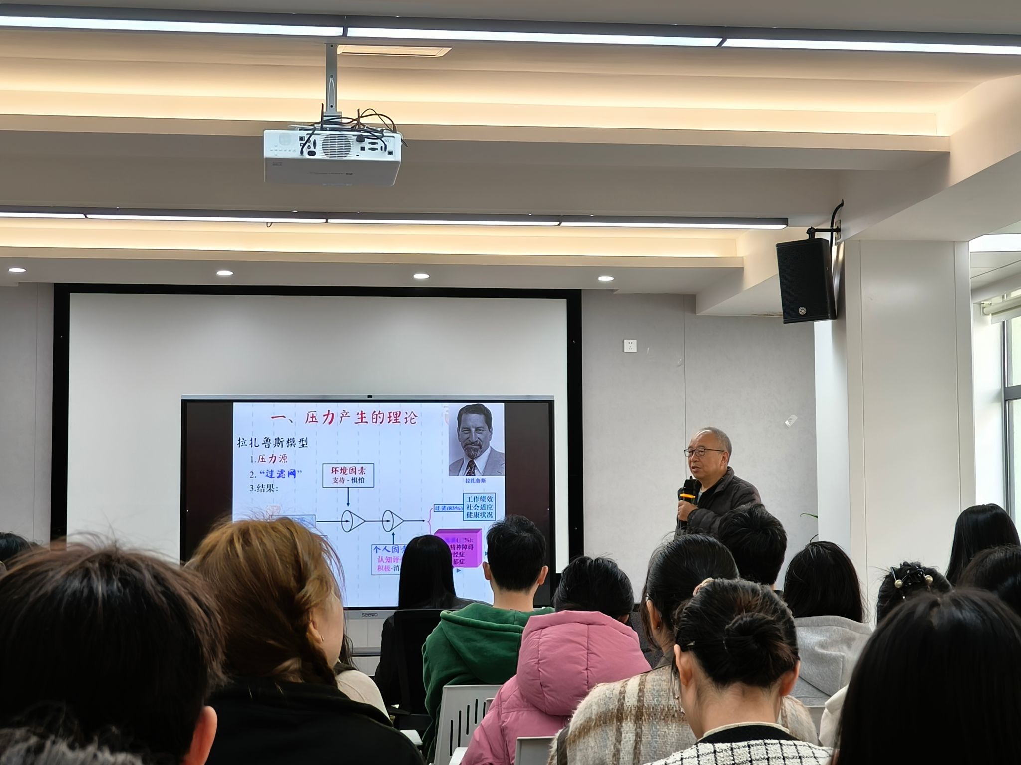党委副书记龚小虹老师担任主持人,首先向大家简单介绍原献学教授并表示了热烈欢迎。讲座伊始,原献学教授通过生动的案例和深入的分析,为在场的研究生们详细阐述了心理健康的重要性。原献学教授运用拉扎鲁斯模型向同学们介绍了压力产生的机理,并从压力源、“过滤网”、结果三个阶段对拉扎鲁斯模型进行介绍。