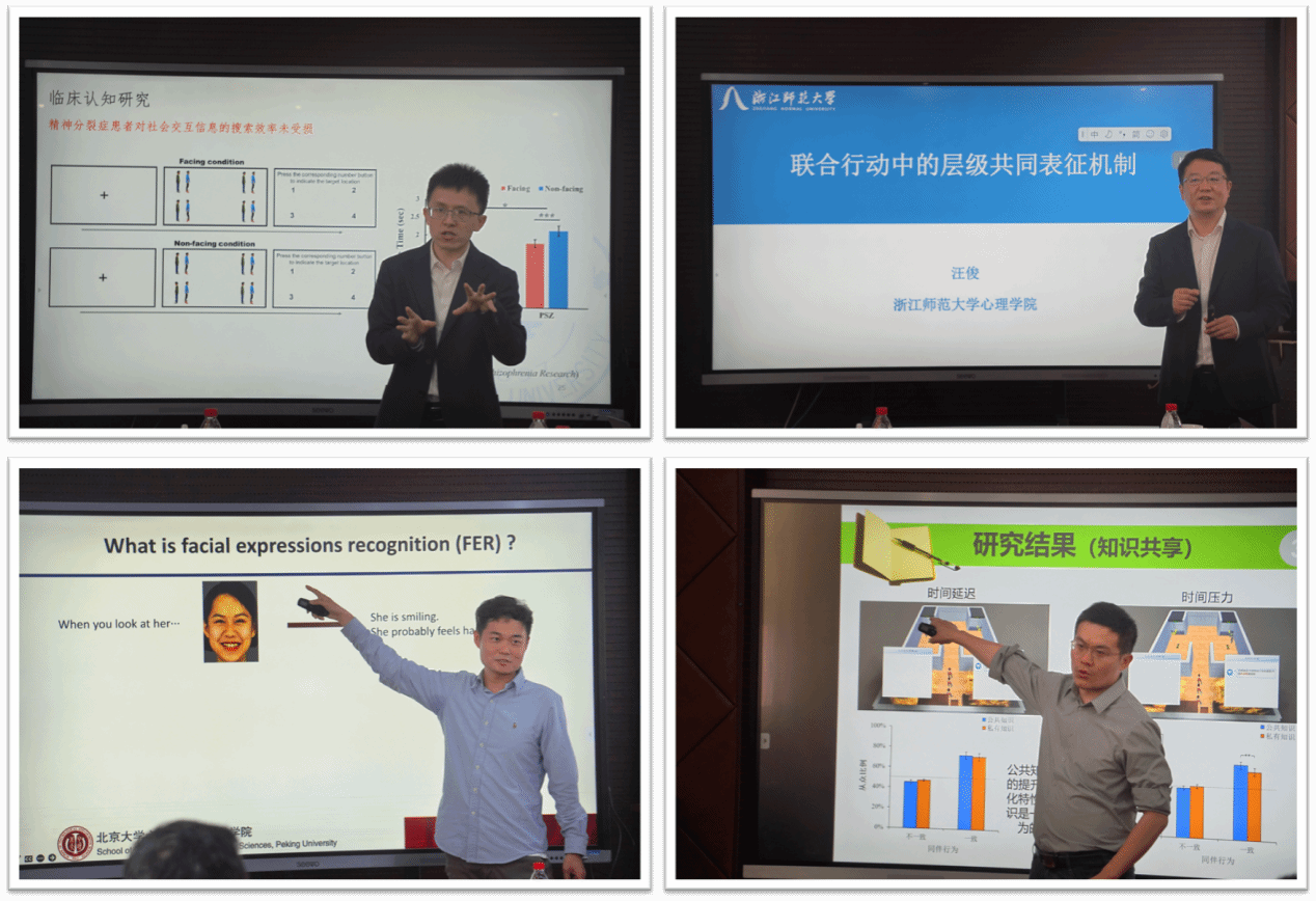 在本次论坛中,浙江大学陈辉教授以“社会交互对信息加工的影响”为题,介绍了其团队在社会认知交互信息的无意识加工等方面取得的最新研究成果。陈辉教授在报告中提出,社会交互信息具备独特加工优势,使其能够在无意识层面获得加工。其团队采用双眼竞争范式,对该假设进行了检验,陈辉教授对相关研究的结果进行了详细介绍。在此基础上,陈辉教授还介绍了精神分裂症患者、孤独症儿童在识别社会交互信息时的特殊加工模式,对社会交互研究在临床方面的应用进行了分享。浙江师范大学汪俊教授以“联合行动中的层级共同表征机制”为题,介绍了联合行动中互动双方认知机制方面的最新发现。其团队基于共同表征理论和加工水平理论,借助双人情境下的统计学习任务,发现了联合行动中互动双方在决策标准和辨别力方面的变化。借助基于脑电图的超扫描技术,汪俊教授团队还对联合行动中互动双方的脑内功能连接及脑间同步性进行了分析,并构建了层级表征模型。解万泽研究员以“From Seeing to Understanding: Unraveling Perceptual and Conceptual Contributions to Children’s Facial Expression Recognition”为题,介绍了儿童在面部表情识别方面的发展特点及其对应的认知加工过程。解万泽研究员首先介绍了面部表情识别的基本理论模型,并重点强调了知觉线索和语义概念在面部表情识别中的作用。借助脑电图图技术和表征相似性分析,解万泽研究员及其团队发现儿童在识别正性和负性面部表情时存在差异,且对负性面部表情的分辨能力较差。解万泽研究员还解释了该结果对于理解儿童面部表情识别发展过程的理论意义。尹军教授以“盲从还是理性?基于共享现实的从众行为”为题,介绍了其团队基于虚拟仿真技术考察从众行为时所获得的新发现。尹军教授在汇报中指出,其团队为区别从众行为的信息性影响和规范性影响,引入了公共知识和私有知识的区分,考察了不同知识状态对从众的影响。借助此类研究范式,尹军教授及其团队成员还探讨了抑郁症群体独特的从众模式,并就该结果可能反映的信息加工模式进行了说明。现场师生在听完各位专家老师分享后都深有感触,纷纷举手提问,与几位专家老师展开了热烈的讨论、交流。