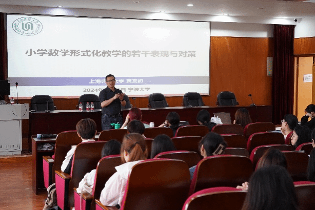 讲座全程,黄教授围绕“小学数学形式化教学的若干表现与对策”,从数学教学的目的、实质、形式化教学的若干表现及形式化教学的对策四个方面向同学们阐述自己对小学数学教育的见解与观点。其中,黄教授指出小学数学教学不能只强调学科逻辑,还要关注学生认知的逻辑、学生的自我生成。应以数学知识的学习为载体,以数学思维的联结为过程,注重实质、淡化形式。此外黄教授还特别指出,在数学教育中,理解和应用数学知识比单纯的记忆更为关键,强调了通过方程反映现实世界数量关系的重要性,并提倡在小学数学教学中注重旧知识与新概念之间的自然过渡,以提高学生的学习兴趣和整体理解。
