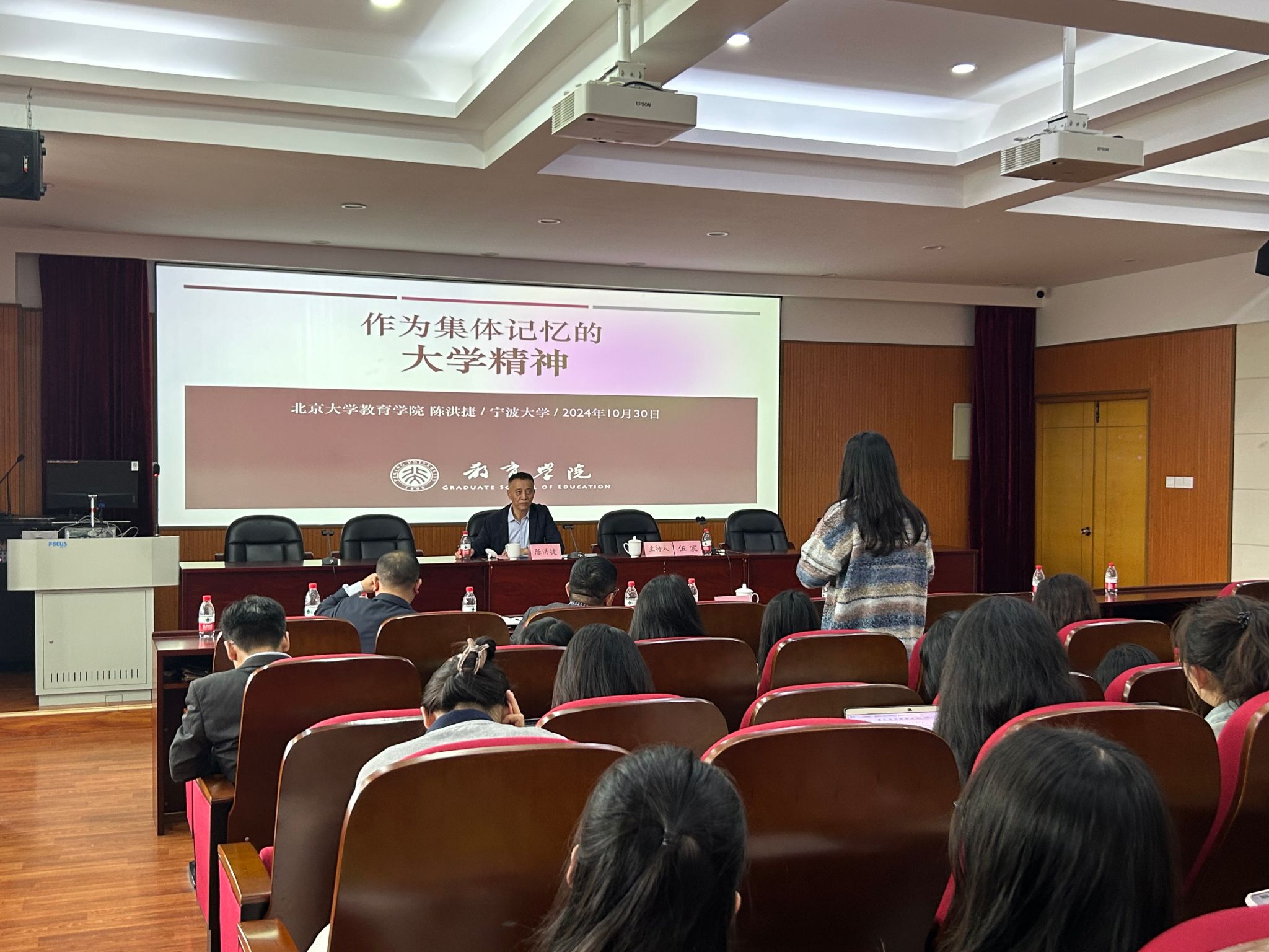 陈洪捷教授以“什么是大学精神”引入,通过列举学者们的观点捕捉到大学精神通常含义为大学的基本理念、价值理念、精神气质、信念、文化、传统和灵魂等。陈洪捷教授进一步归纳出大学精神具有两种含义,一种是制度化、普遍的大学精神,具有着批判精神、社会担当、学术自由、追求真理和价值追求的共性,另一种是具体的、鲜活的大学精神,具有着特色、灵魂、气质和心态的个性。之后,陈洪捷教授通过讲述克拉克的论组织传奇、陈平原的老北大的故事和哈布瓦赫的论集体记忆,提出并论证了大学精神是一种集体记忆。大学精神具有以下特点:以学术人物和故事为核心、讲述虚实结合的故事,有助于形成一个想象的价值共同体、讲述过去是为了现在,规范着当下的行为、官方和民间传播相结合、建构叙述的媒介是纪念仪式、特定物品、特定地点等和特殊的历史背景和历史悠久的程度都是文化记忆形成的基础条件。在讲座中,陈洪捷教授还结合北京大学的实例,生动形象地展示了大学精神的生命力,大学精神具有叙事性、生动性、发展性、体认性、民间性。陈洪捷教授最后指出,虽然大学精神无法化作评价指标,但一流大学必然有其独特的大学精神。