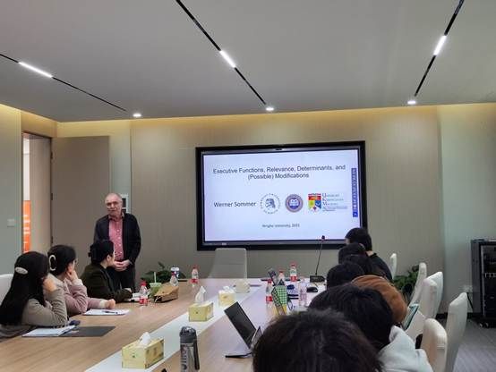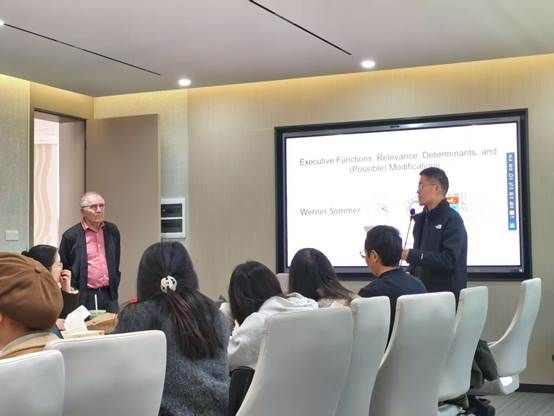 在讲座开始前,尹军教授代表学院对Werner Sommer教授的到访表示热烈欢迎。在此次讲座中,Werner Sommer教授系统阐释了执行功能的三大核心要素——工作记忆、抑制能力和认知灵活性,着重剖析了抑制功能在行为调控中的核心作用。教授还介绍了“热执行功能”这一前沿概念,它涉及情感和社交方面的行为控制,这表明执行功能不仅限于冷认知(如逻辑推理),还涉及情感驱动与社交情境中的执行功能调控机制,为理解人类决策行为提供了新视角。此外,他提到执行功能受损与药物依赖、超重等行为问题密切相关,并分享了通过运动练习和正念训练改善执行功能的最新研究成果。