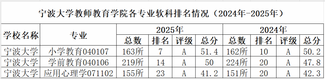 软科数据显示,学院小学教育专业(040107)在全国163所专业中位列第7名(前4.29%),较2024年上升3个位次,总分提升至51.4分,保持A级评级。学前教育专业(040106)进步显著,从2024年的第20名跃升至第14名(前6.39%),在全国219所专业中脱颖而出,总分突破50分,同样获评A级。应用心理学专业(071102)继续保持稳定发展态势,稳居全国前15%行列,保持A级评级,彰显了应用心理学专业建设的稳健性。