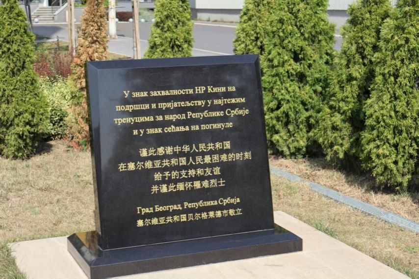 在旧址旁边,还有一块刻有中文和塞文的双语纪念牌,上面记录着中国在塞尔维亚人民最困难的时刻给予的支持与友谊。