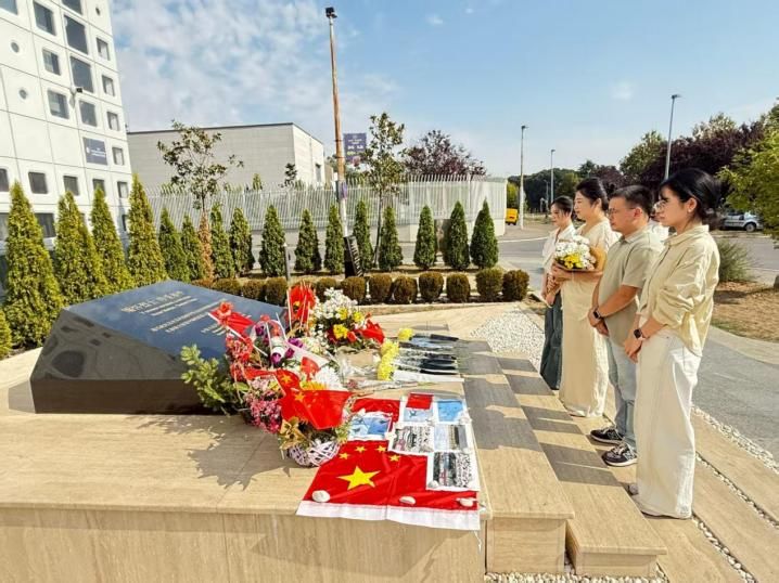 教师党员余利川副教授与刘鑫副教授带领两位硕士研究生在塞尔维亚贝尔格莱德参加2025欧洲教育研究协会年会(European Conference on Educational Research, ECER)。学术交流期间,四位师生怀着无比崇敬与沉痛的心情,前往中国驻南斯拉夫联盟大使馆旧址,凭吊在1999年5月7日使馆被炸事件中牺牲的邵云环、许杏虎和朱颖三位烈士,以高校教育工作者与青年学子的赤诚,传递跨越时空的缅怀与敬意。