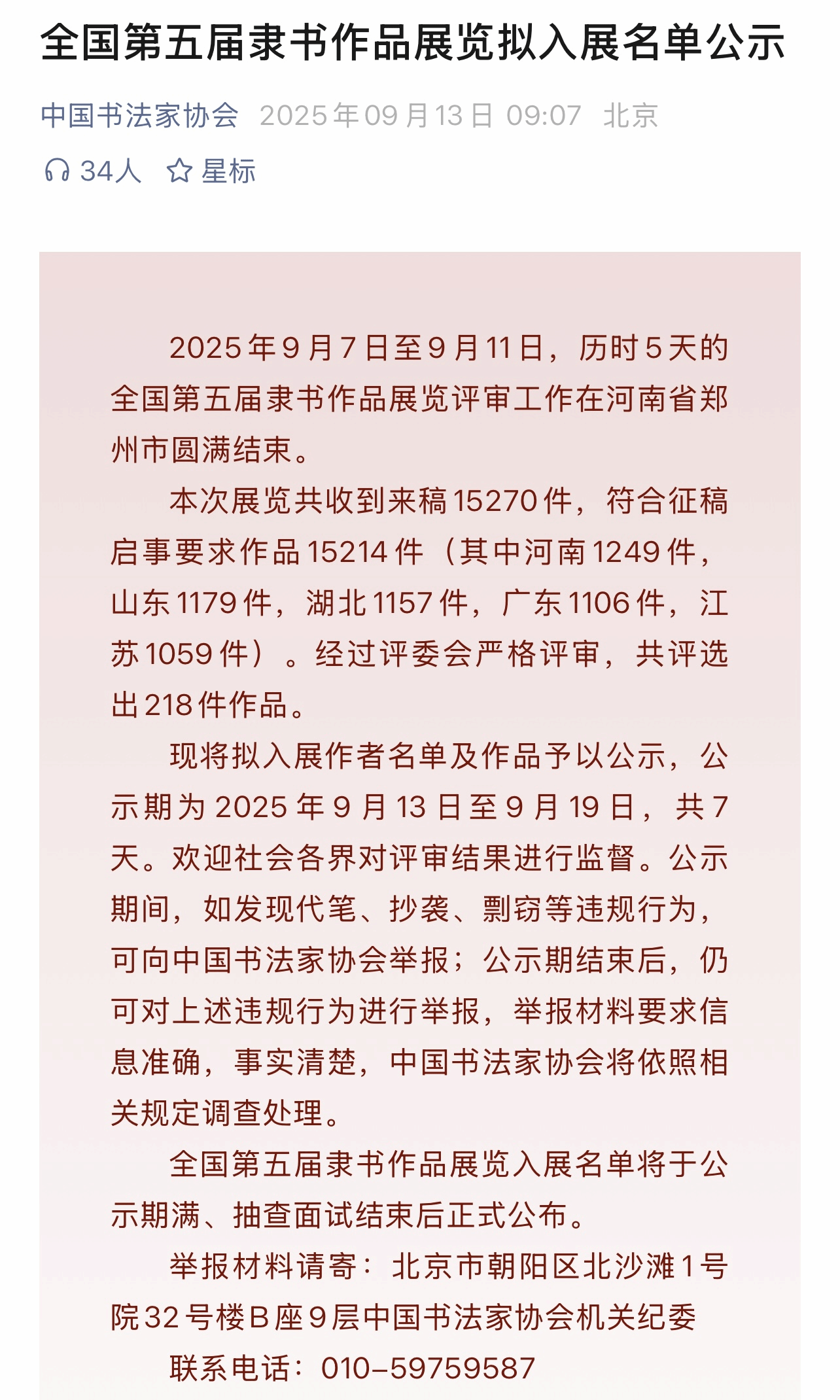 全国第五届隶书作品展览作为国内隶书领域的重要专业赛事,于2025年9月7日至11日在河南省郑州市完成评审工作。本次展览共收到来自全国各地的15270件来稿,经严格筛选后,符合征稿要求的作品达15214件,经过评委会专业、严谨的评审,最终仅有218件作品入选,竞争尤为激烈。