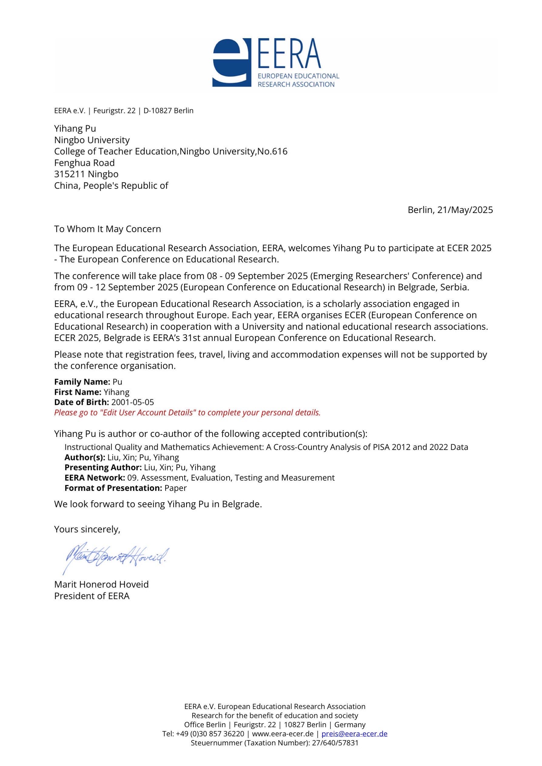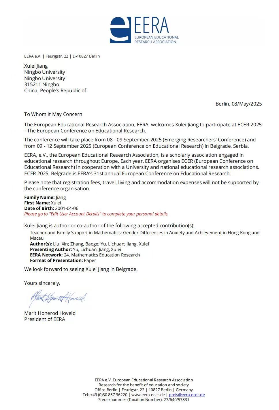 国际化发展战略,2025年9月8至12日,由欧洲教育研究协会(European Educational Research Association, EERA)主办的 2025 年欧洲教育研究年会(European Conference on Educational Research, ECER)在塞尔维亚贝尔格莱德举行。我院余利川副教授、刘鑫副教授,以及 2023 级硕士研究生蒲艺航、2024 级硕士研究生蒋栩蕾受邀参会并作学术报告,与来自全球的两千余名教育研究者同场交流与学习,充分展示了我院在教学质量、教育公平与学习情感等研究方向的最新进展。