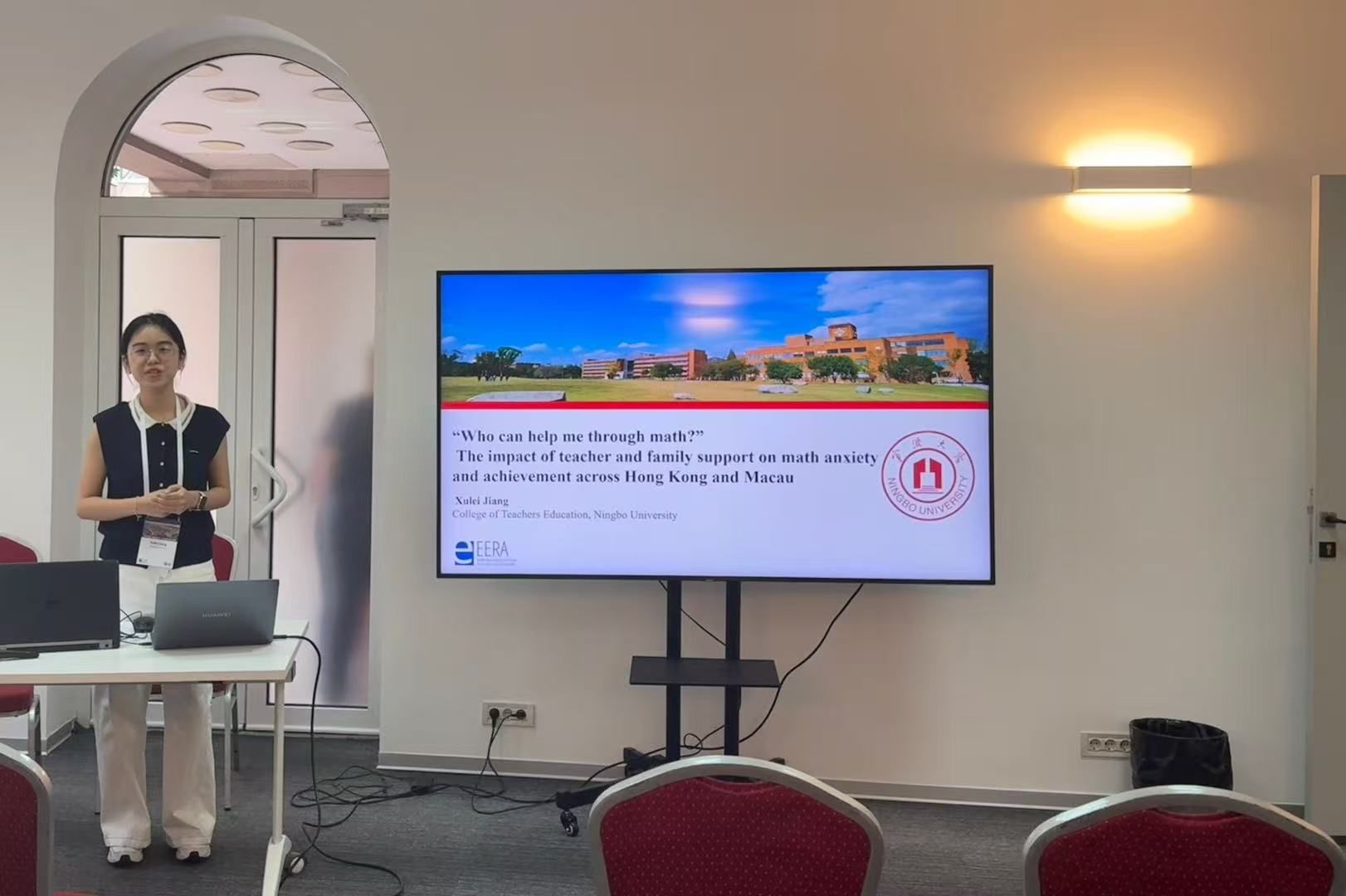 在 Network 24 “Mathematics Education Research”分会场,24级硕士研究生蒋栩蕾作题为《Teacher and Family Support in Mathematics: Gender Differences in Anxiety and Achievement in Hong Kong and Macau》的会议报告,该报告由我院刘鑫副教授、张宝歌教授、余利川副教授共同指导硕士研究生蒋栩蕾完成。研究基于 PISA 2022数据,以控制价值理论为框架,聚焦香港和澳门15岁学生群体,探讨教师支持与家庭支持对学生数学焦虑、学业成绩及性别与社会经济地位差异的影响。结果表明在港澳两地,女生与低社会经济地位学生焦虑更高;数学教师支持在两地都稳定地降低焦虑、提升成绩,而家庭支持呈现情境与性别特异(仅在香港对男生有缓解焦虑、对成绩略负相关),说明“支持”并非一概有益。同时表明“支持”的情感意义具有情境依赖性,应当在课堂实践与家校协同中更精准地匹配学生需要。该研究为理解东亚文化背景下,尤其是港澳地区独特教育生态中,支持系统与学生数学学习情感、学业表现的关系提供了具体视角,对相关领域探讨教育支持的针对性与适配性具有参考意义。
