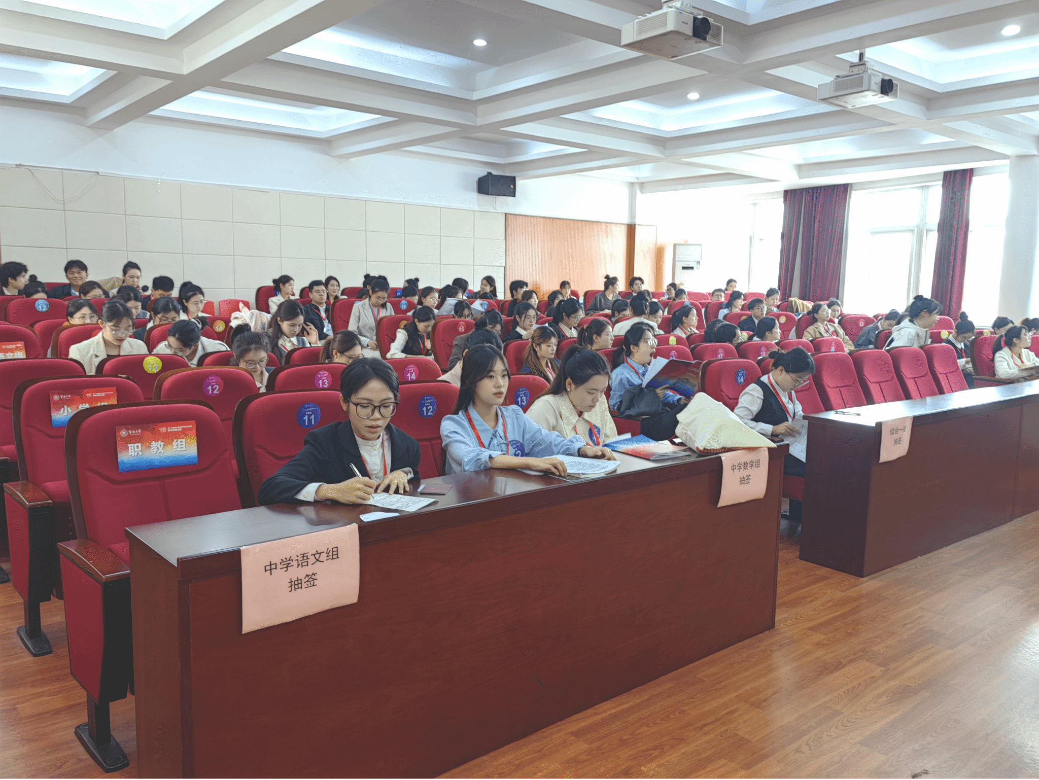 本届大赛决赛吸引了来自全省25所高校的401名学生参赛。大赛设有小学组、英语组、中学语文组、中学数学组、综合一组、综合二组、综合三组、学前组、职教组9个组别,覆盖不同教育阶段和学科领域。竞赛角逐中,参赛选手们怀揣前沿教育构想,凭借扎实的学科积累、亮眼的教学技巧和自然流畅的表达能力,带来了一堂堂趣味十足、干货满满的课堂,充分彰显了专业实力与青春风采。评委们围绕即席讲演、模拟上课(说课)、现场答辩、保教活动分析等维度,考察选手的教学设计、课堂驾驭、语言表达等综合能力。