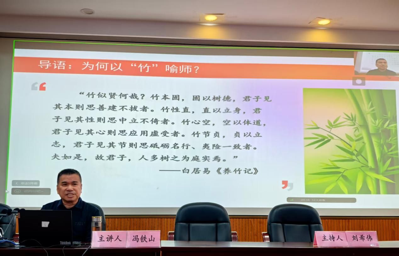 冯铁山教授以“遇见更好的自己——新时代,我们该如何做导师”为主题,结合自身数十年的研究生指导经验与前沿教育理论,巧妙以“竹”为喻,从导师内涵、政策理念、导学内容、机制路径与自我修养五个维度展开系统而深刻的分享。