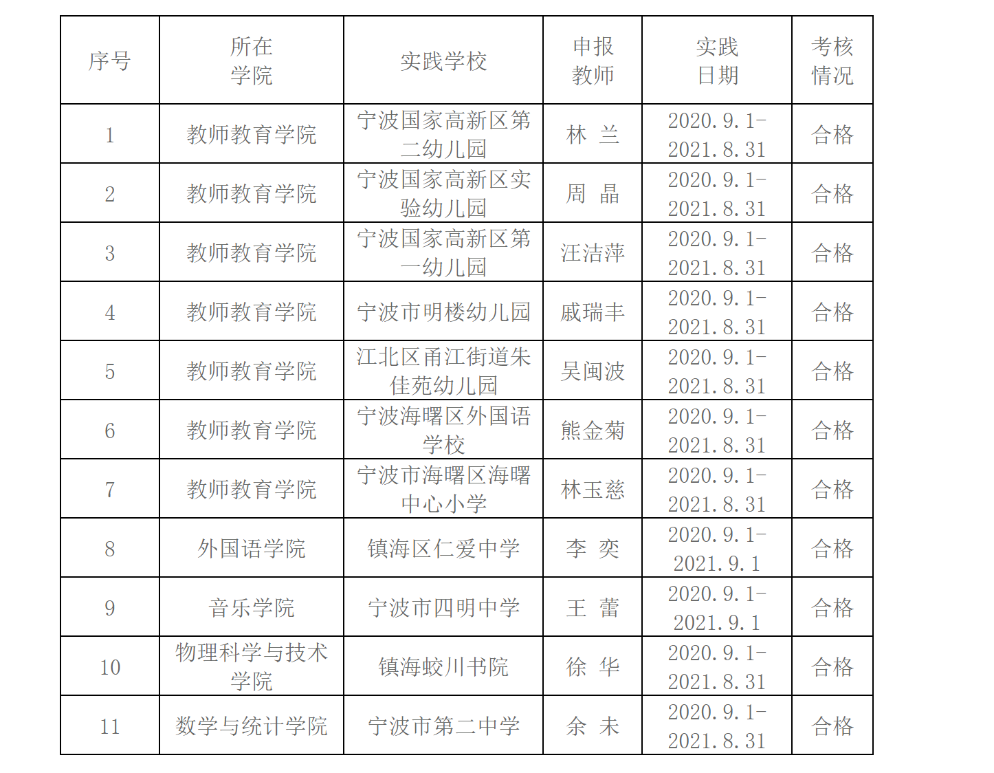 根据《包子漫画 教教师教育实践能力培养实施办法(试行)》(宁大政〔2020〕40号)文件,教务处对2020-2021学年教师教育实践能力培养考核合格的相关人员进行公示,具体名单如下:
