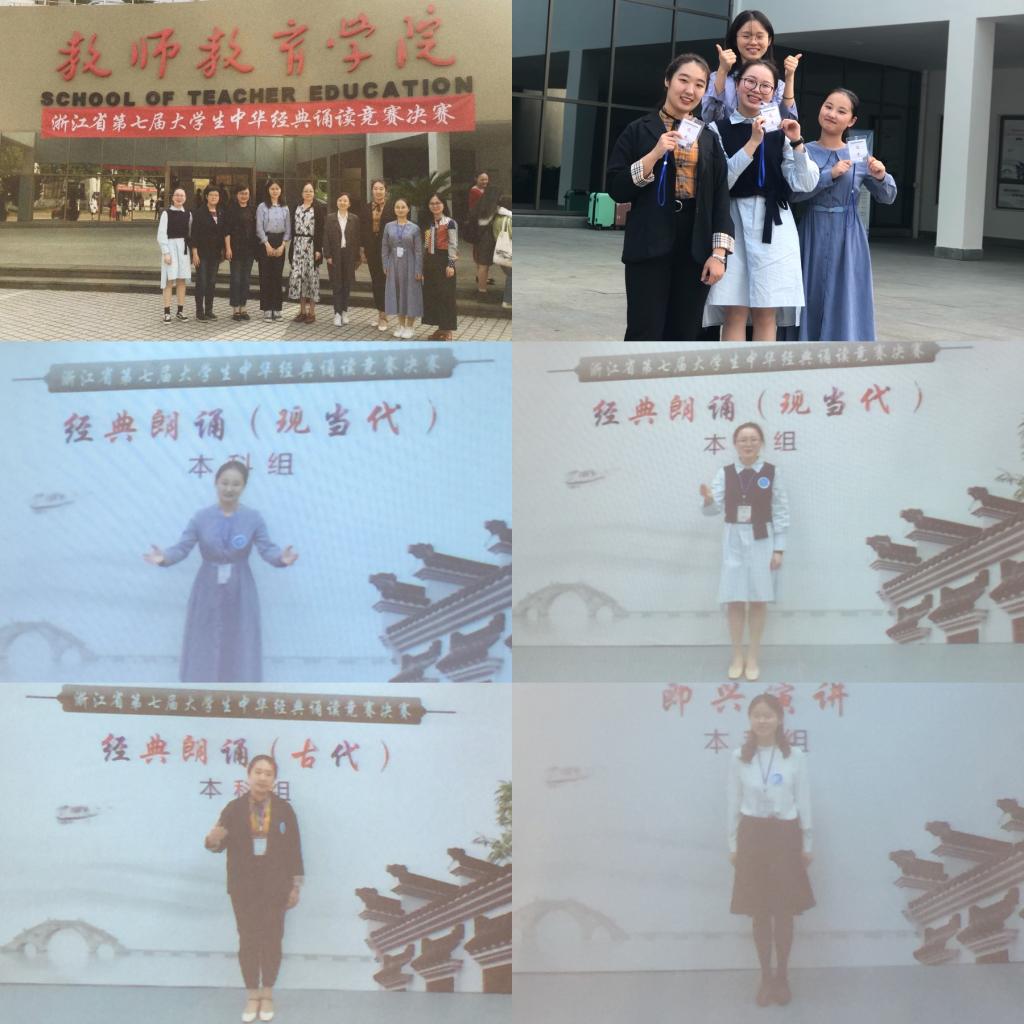 1019-20,由浙江省大学生科技竞赛委员会主办的“浙江省第七届大学生中华经典诵读竞赛”决赛在绍兴文理学院举行,经过“中华经典朗诵”、“即兴演讲”与“回答问题”三个环节的角逐,我校8位参赛选手共获得一等奖1项、二等奖3项、三等奖4项的佳绩。