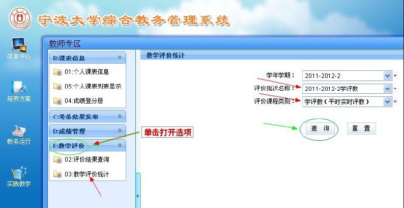 1. 教师登录教务管理系统:“ 教师专区”-“教学评教”-“教学评教统计”。