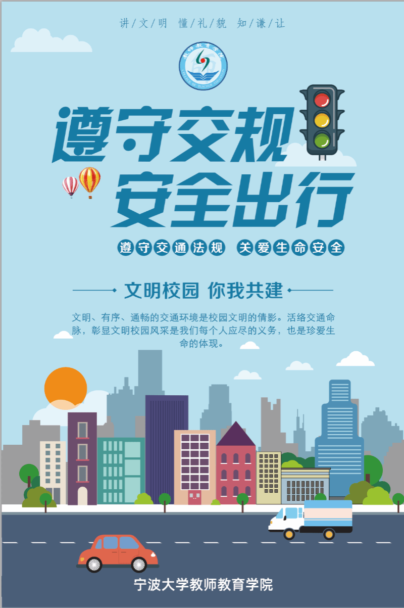 2.交通安全海报:遵守交规,安全出行。文明、有序、畅通的交通环境是校园文明的重要体现。我们呼吁大家严格遵守交通法规,珍爱生命安全,共同推动文明校园建设。