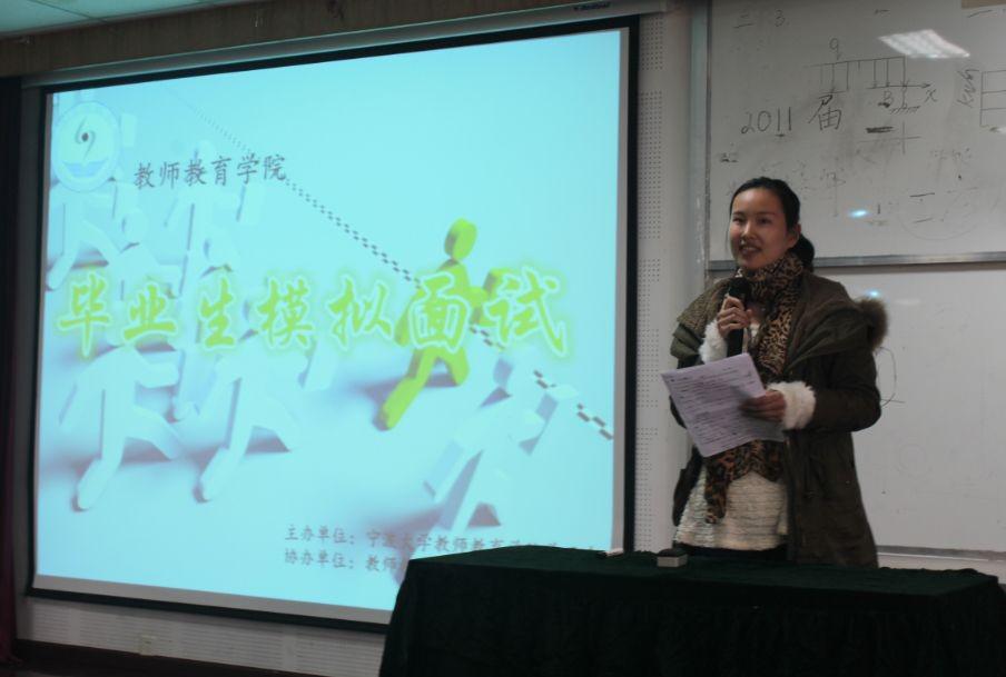 在西区实验楼313进行了开展“毕业生模拟面试”活动。本次活动分为“演讲·试讲·点评”三部分,来自学前教育,小学教育以及英语教育共六名学子参加了此次面试。