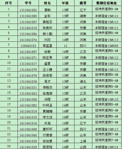 一、申请留宿学生统一集中住宿,男生安排在本部宿舍10#楼、女生安排在本部宿舍15#楼以及本部学生公寓招待所(本部公寓四期楼下),个别学生安排在寒假开楼宿舍,住宿名单分别张贴在集中住宿楼内,同时在学生社区网上也进行公布。