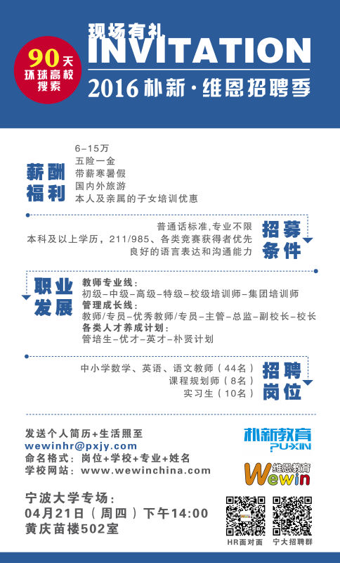 6. 总部面试地址:浙江省宁波市江东区 桑田路 722 弄 16 号 3 楼维恩教育 人力资源部