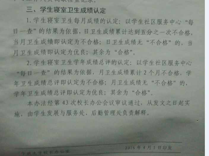 根据宁大政〔2016〕23号文件《关于印发〈包子漫画 学生寝室卫生检查实施办法(试行)的通知〉》要求,学生社区负责对学生寝室卫生进行检查。学校检查时间为:周一到周三普查,周四、周五复查前面不合格的寝室,学院每周日进行寝室卫生的常规检查,学校和学院的卫生检查结果共同计入当月寝室卫生成绩的考核。具体考核原则如下: