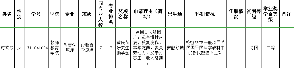 研究生院考虑到我院研究生贫困生总量较大,给予我院增补一名“绣山清寒优秀学生奖学金”名额。学院研究生奖助学金评审委员会办公室根据前期申报情况,拟推荐时欢欢为“绣山清寒优秀学生奖学金”推荐学生,现予以公示。