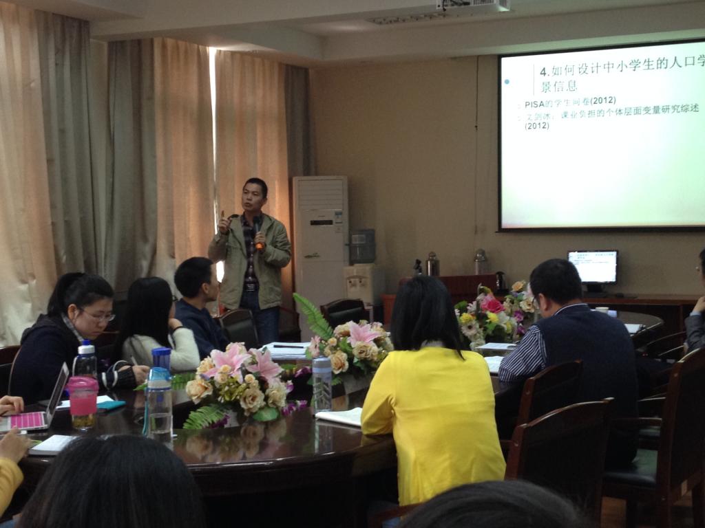 老师就“如何设计学校质量的题项?”“是否增加学生学科偏爱方面的人口学背景信息?”“作业负担问卷编制的价值”等问题进行了讨论。(顾应凤供稿,张赵姝影摄影)