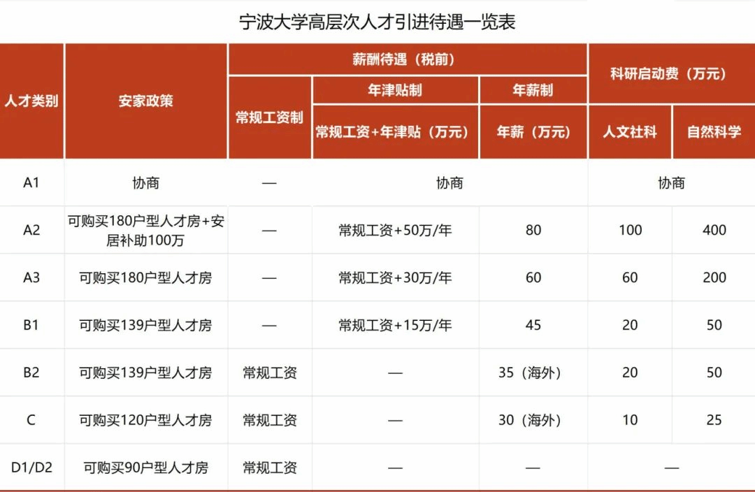 安居优享:引进人才符合宁波市政策条件的,可在学校基础上叠加享受15-800万元的各类安居补助。首聘期内,A2、A3、B1类人才可在年津贴制和年薪制中选其一执行。