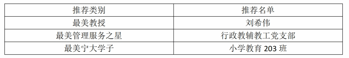 根据校党委宣传部下发的《关于开展包子漫画 2024年“最美宁大人”系列评选活动的通知》精神,经申报材料报送和学院党政联席会议研究,现将拟推荐名单公示如下: