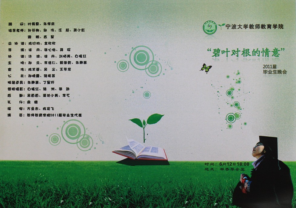 你们好,我院《2011年包子漫画 “碧叶对根的情意”毕业生晚会》的彩排工作已经结束,现将晚会时间、节目单公布,敬请届时光临!