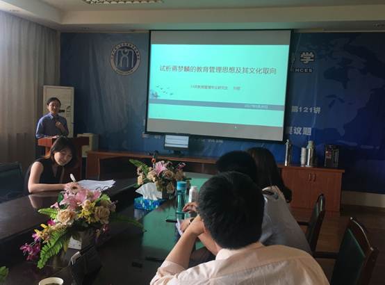 孙丽同学报告的题目《试析蒋梦麟教育管理思想及其文化取向》,首先从蒋梦麟的生平入手,重点介绍了他任北大校长期间的管理经验,分析了蒋梦麟科层式管理模式“教授治学,学生求学,职员治事,校长治校”以及鼓励学生组成团体“本自治之能力,研究学术发挥一切,以期增强文化”的管理理念,阐明了蒋梦麟“亦中亦西”的管理文化取向以及对当代教育管理实践的经验与启示,该主题引起了与会同学的热烈反响。