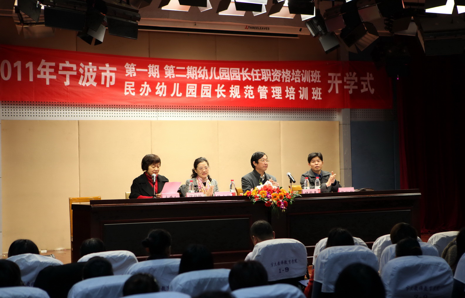 2011121上午宁波市第一期、第二期幼儿园园长任职资格培训班暨第一期民办幼儿园园长规范管理培训班开学仪式在我院举行。宁波市教育局林小云调研员、市干训中心黄和林副处长出席本次活动。开学式由沈丹丹副院长主持,叶锡恩书记致辞,唐敬芬老师介绍培训计划。宁波市江北中心幼儿园林晓萍老师和奉化溪口中心幼儿园姜雪娜园长分别代表参加任职资格培训的学员和民办幼儿园园长发言,她们表示将珍惜宝贵培训机会,不辜负政府和人民的期望,好好学习,努力提升自身的理论素养,丰富、充实自身的实践经验。